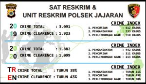 Dalam hitungan kasus ditahun 2020 terdapat penurunan angka kriminilitas bila kita bandingkan dengan jumlah kasus kriminal yang terjadi di Tahun 2019, dimana terdapat 612 kasus pencurian, penganiyaan 513 kasus, dan perlindungan anak terdapat 510 kasus.